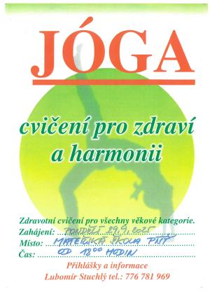 Jóga - cvičení pro zdraví a harmonii pod vedením Lubomíra Stuchlého zahajuje v pondělí 29.9. od 18 hod v Mateřské škole Píšť.